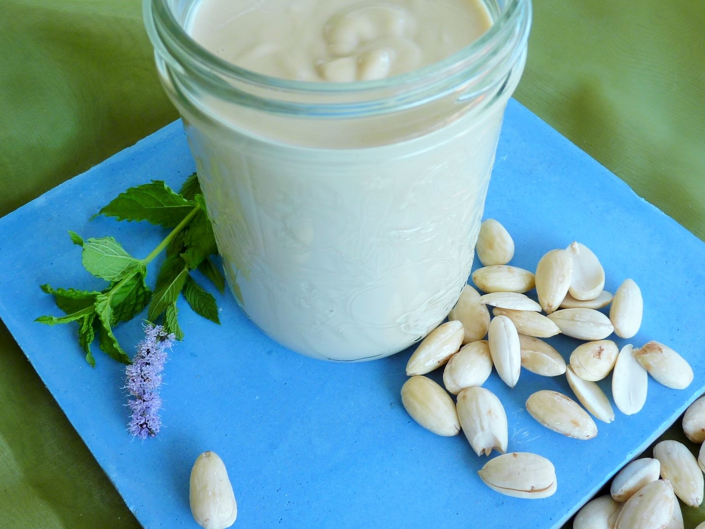 Alles wieder in die Küchenmaschine und gemixt auf höchster Stufe. Aber es wurde nur krümelig. Aus lauter Frust habe ich ein Glas Wasser in die Masse gekippt und plötzlich wurde es eine homogene weißliche Masse, wieder in den Vitamix auf hohe Stufe und es wurde eine sehr homogene Masse. Es sah aus wie Marzipansoße und schmeckte auch noch so.