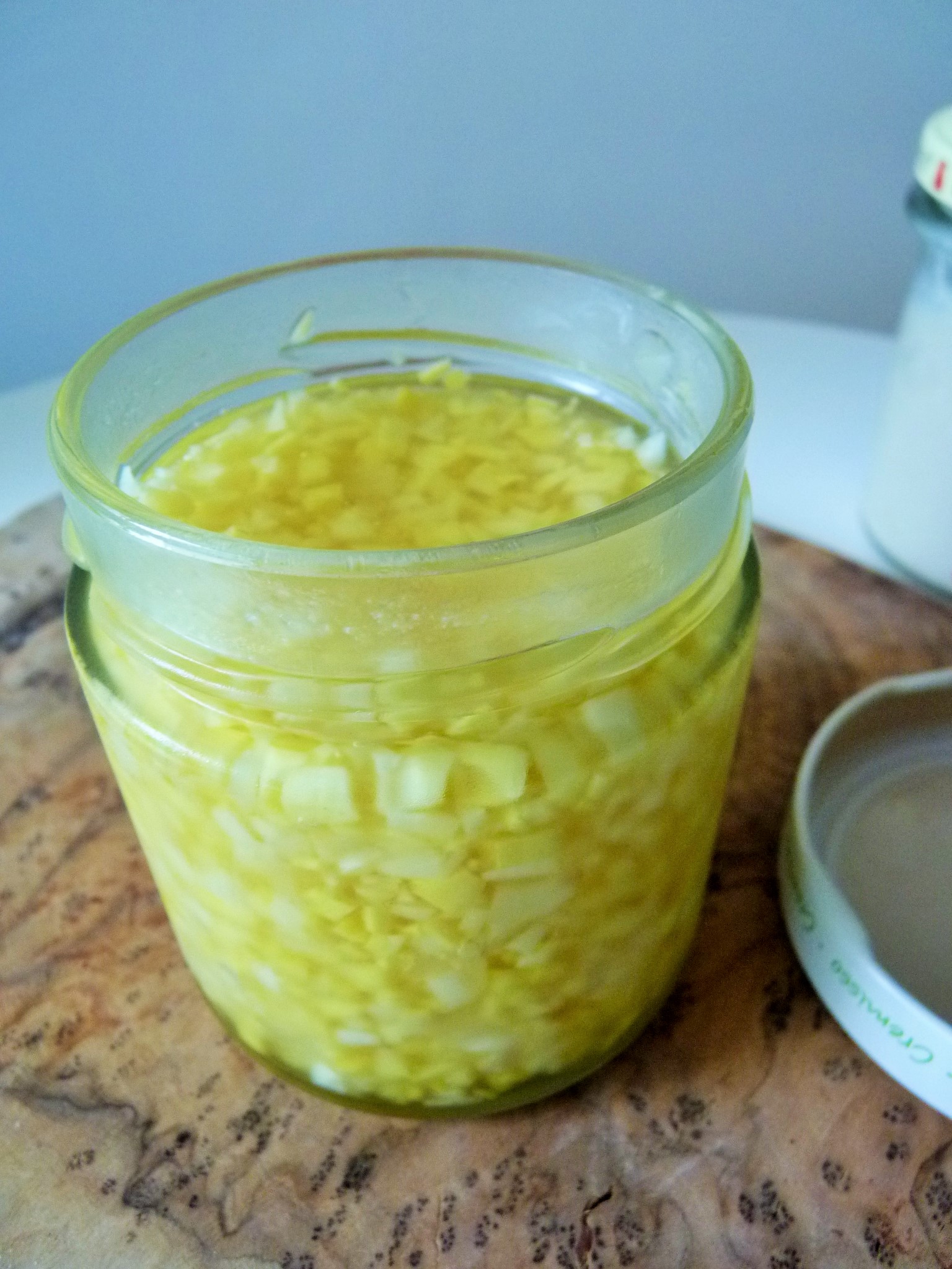 In Südindien sind Knoblauch und Ingwer wichtiger Bestandteil der Gewürze. Es wird kleingehackt und in Öl leicht angebraten bevor das Gemüse, die Linsen oder der Reis dazukommt. Ich benutze viel Knobi-Ingwer und habe mir einen kleinen Vorrat angelegt: