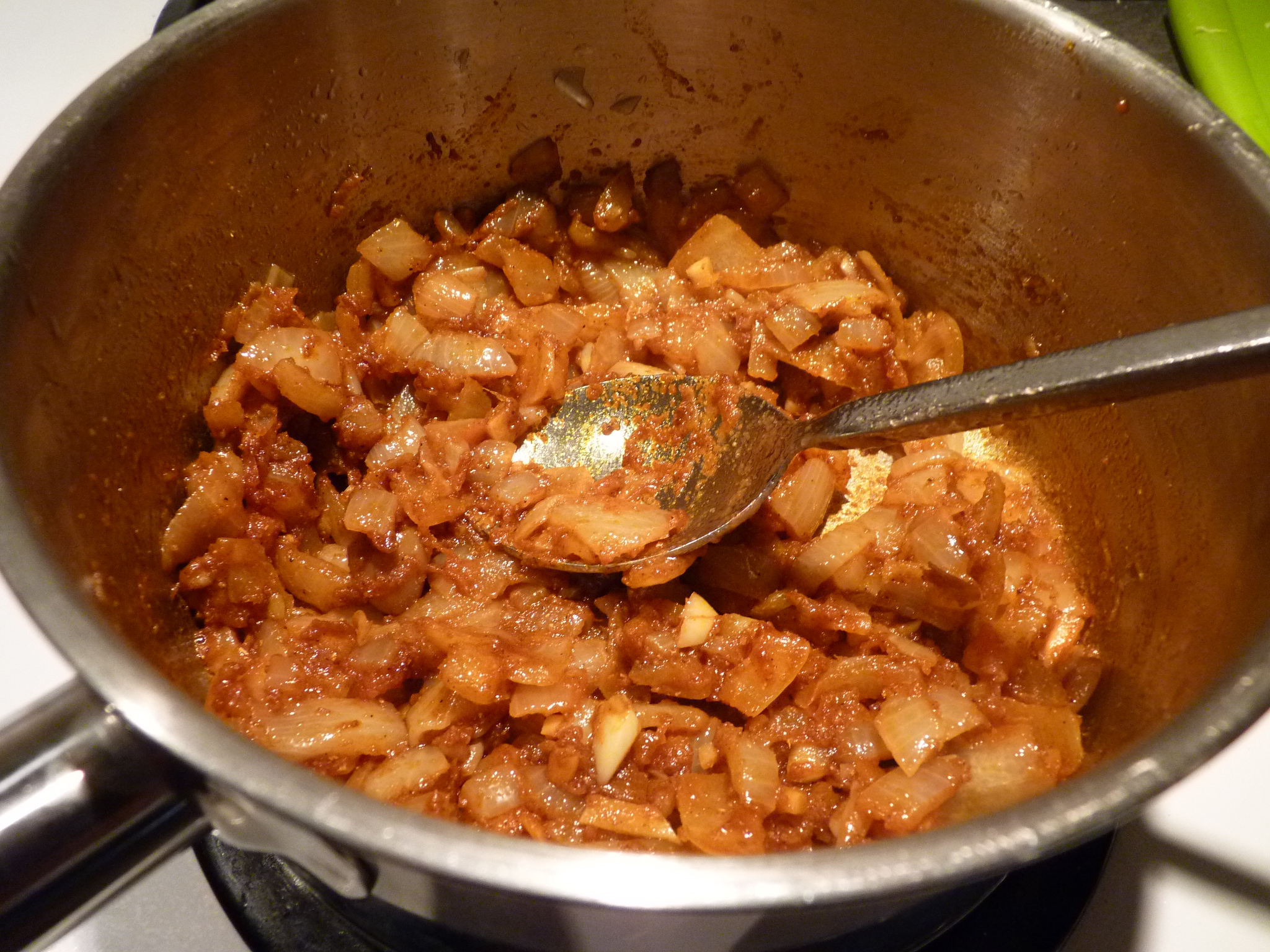 Für die Soße wird das Öl in einem Topf erhitzt, die kleingehackten Zwiebeln dazugeben und ca. 15-20 Min. glasig dünsten, dann den kleingeschnittenen Knoblauch dazugeben und weitere 2 Min. mitbrutzeln. Hier wird nichts braun oder knusprig. Dann alle Trockengewürze in die Zwiebel-Knobi Mixtur geben. Gut umrühren und ein Paar Minuten mitgaren. Die Tomatenstücke dazu und wieder rühren und ein paar Minuten köcheln lassen. Am Schluss vegane Milch dazugießen und weiter 2 Minuten köcheln.
