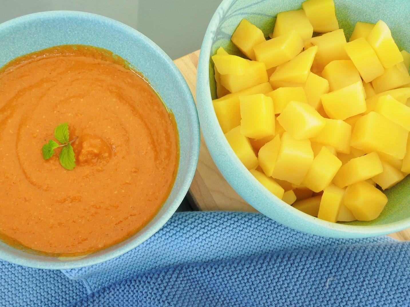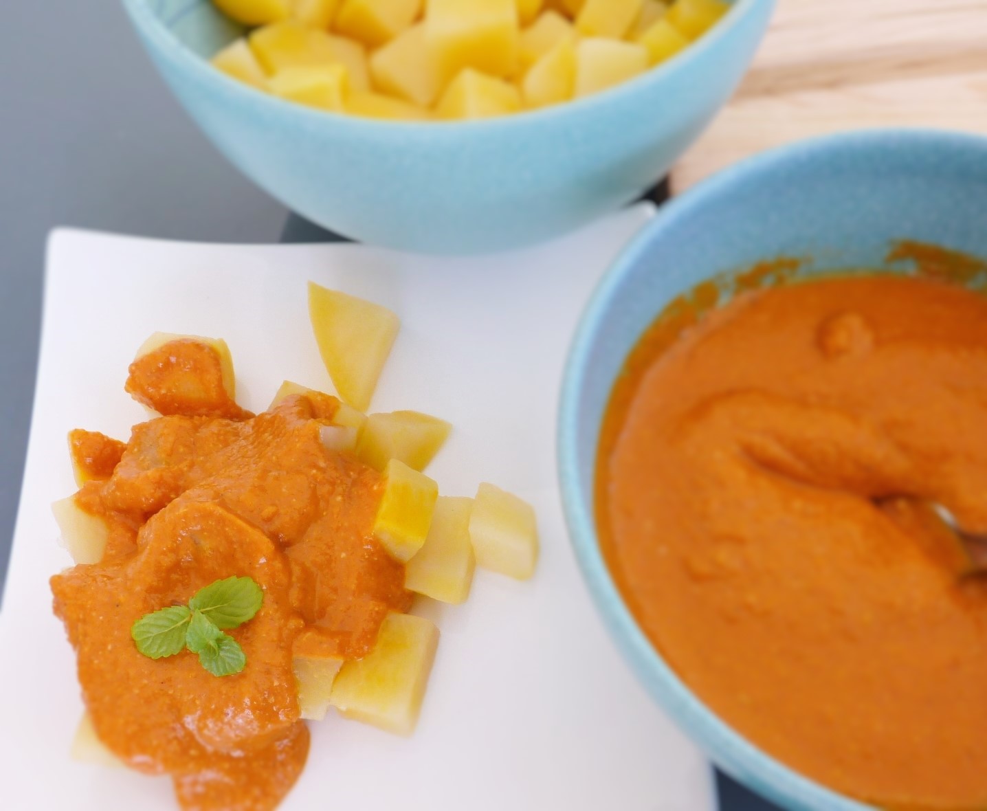 Hitze abschalten und den Inhalt des Topfes pürrieren. Die Cashewbutter (auch Cashewmus) oder die vegane Butter unter die Soße rühren und fertig ist die Butter Chicken Soße.
