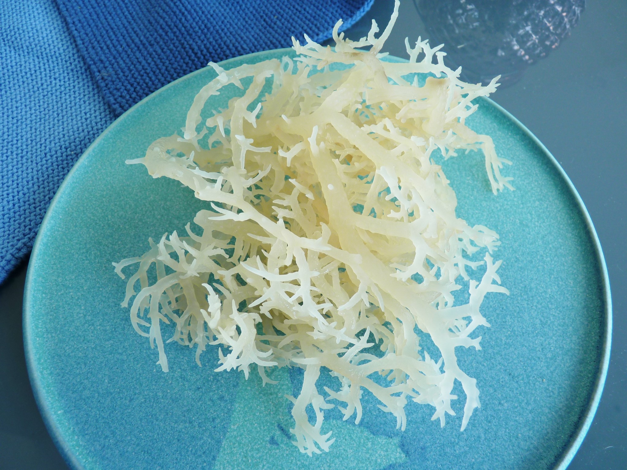 Beides geht ausgesprochen gut. Aus Los Angeles habe ich Irish Moss mitgebracht. In meinem Lieblingsrestaurant Gafe Gratitude in Venice wird es in Torten, Kuchen und Dips zum Kaltgelieren verwendet und da habe ich es auch gekauft. Es handelt sich dabei um den weißen Knorpeltang, der wesentlich milder ist als der Rote. Irish Moss ist eine sehr nährstoffhaltige Alge, die in Verbindung mit Wasser gallertartig aufquillt und deshalb oft in der Rohkost als Geliermittel eingesetzt wird. Es muss nicht erhitzt werden wie Agar Agar z.B.
