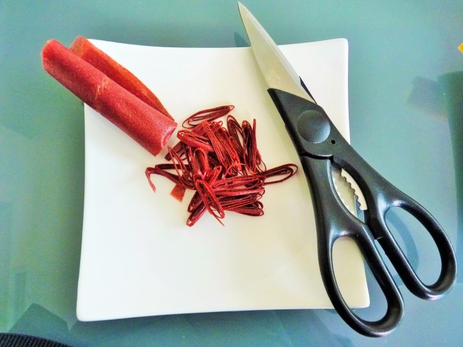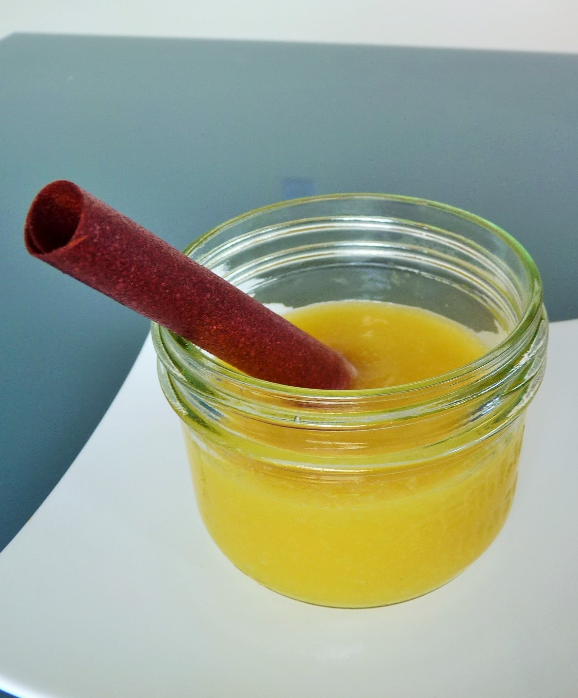 wer möchte kann auch noch etwas Vanille und Zitronensaft dazugeben Das Ganze im Vitamix oder anderen Blender zu einem Fruchtbrei pürieren und auf eine Folie vom Dörrgerät gießen. 8 Stunden bei 41 Grad oder bis es flexibel trocken ist, aber nicht brüchig.