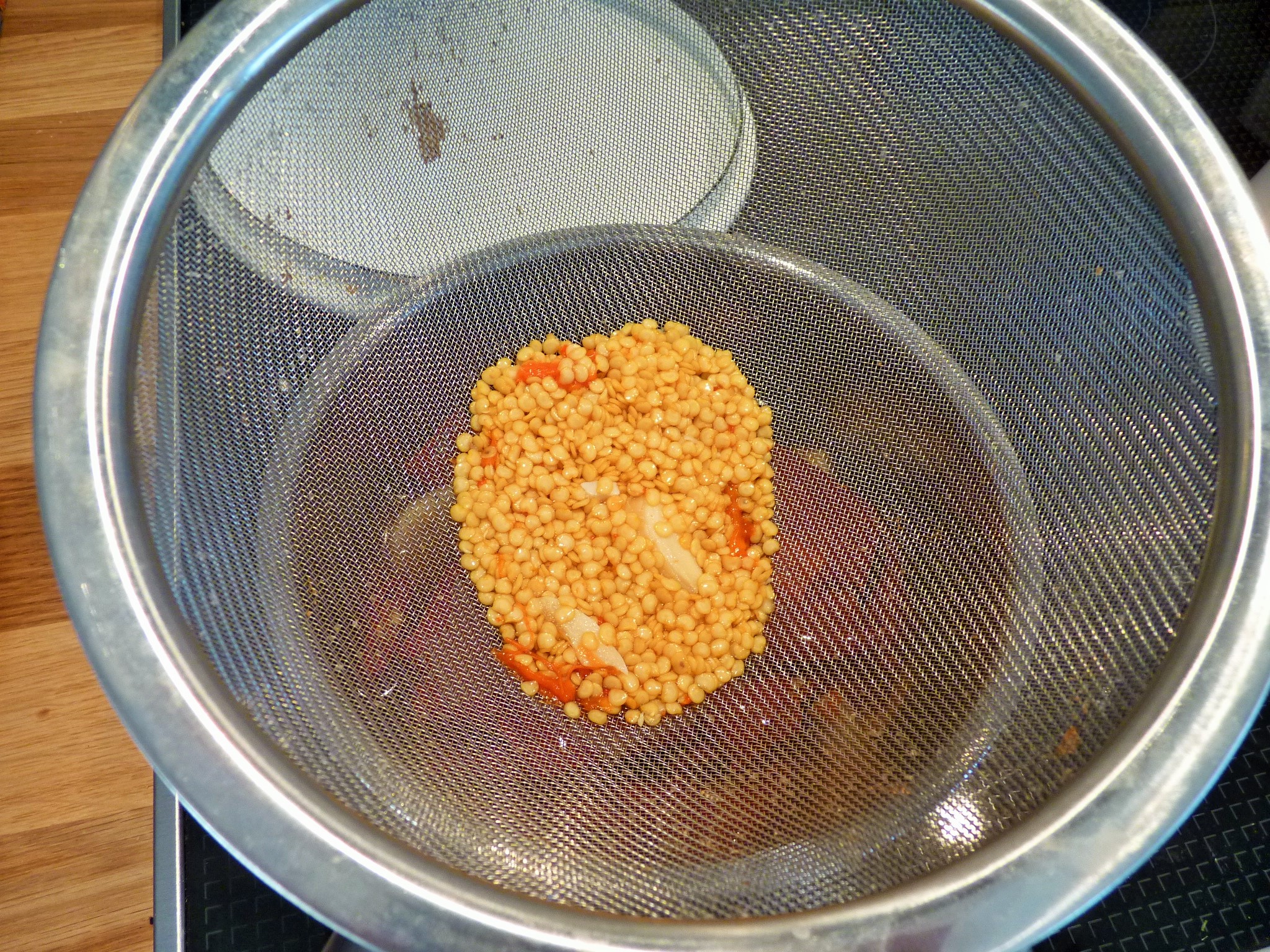 Nun gebe ich die gekochten Stücke in den Vitamix und die Flüssigkeit durch ein Sieb, damit die meisten Kerne draußen bleiben. Alles pürieren, nochmal durch ein Sieb geben und mit dem Zucker und Salz aufkochen.