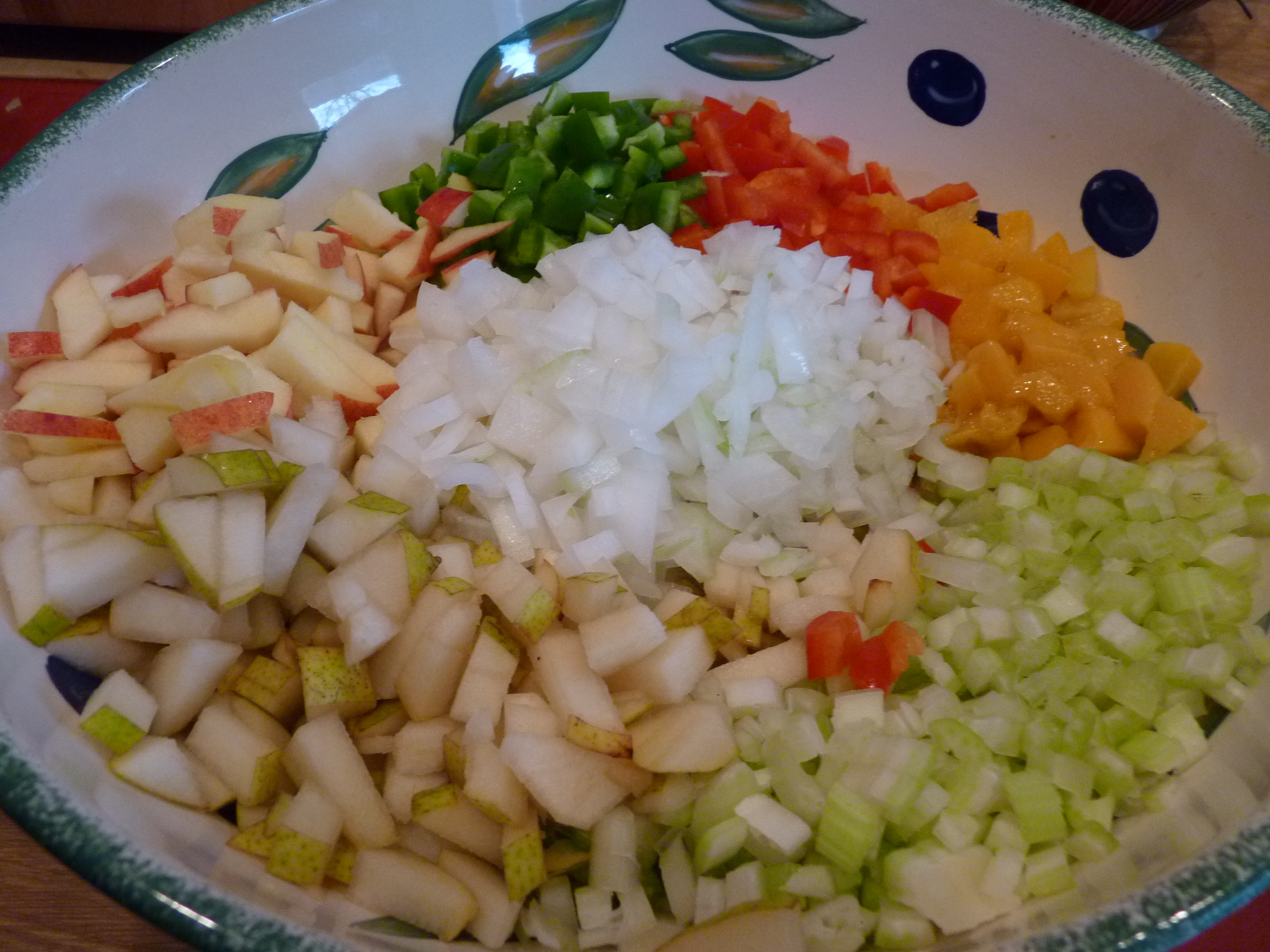 Gemüse und Obst in kleine Stücke schneiden, die Tomaten in einen großen Topf geben, dazu Essig und Zucker. Die Gewürze kommen in einen kleinen Beutel und der wird gut mit der Masse zugedeckt.
