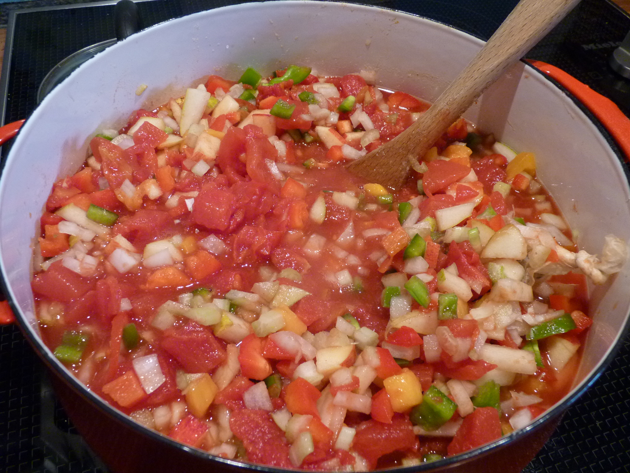 Alles gut im Topf verrühren und eine halbe Stunde ziehen lassen. Dann ca. 3 Stunden köcheln/simmern oder bis alle Zutaten weich, aber nicht verkocht sind. Der Ketchup soll weder aus harten Stücken bestehen noch aus verkochtem Gemüse-Obst.