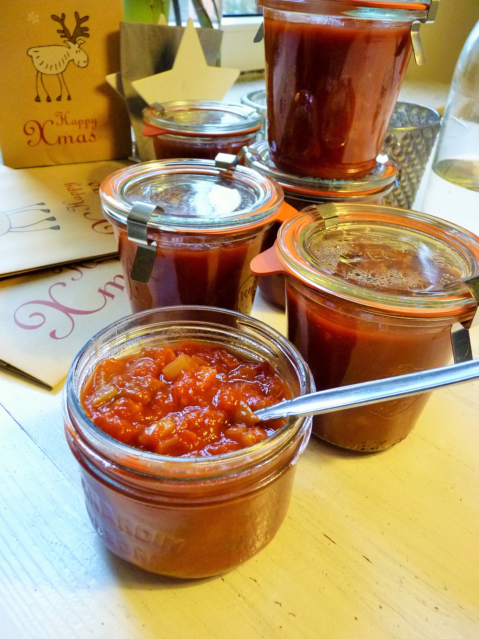 machen wir jedes Jahr wieder. Ich bin etwas spät dran, aber dafür sind es gleich ein paar Geschenke zu Weihnachten. In der kanadischen Provinz Quebec ist der Fruchtketchup eine Spezialität, die zu meat pies (mit Hackfleisch und Kartoffeln gefüllter Pie) gegessen wird, ganz besonders zu Weihnachten hat der Ketchup seinen festen Platz auf dem Tisch. Hergestellt wird der Ketchup aus Tomaten, Birnen, Pfirsichen, Paprika, Sellerie, Zwiebeln und Gewürzen. Das schmeckt auch besonders gut zu veganen Gerichten, wie gebratene Kartoffeln, Gemüse oder Aufläufe.Dann mal die bio Zutaten für ca. 8 x 250ml Weck Gläser einkaufen: