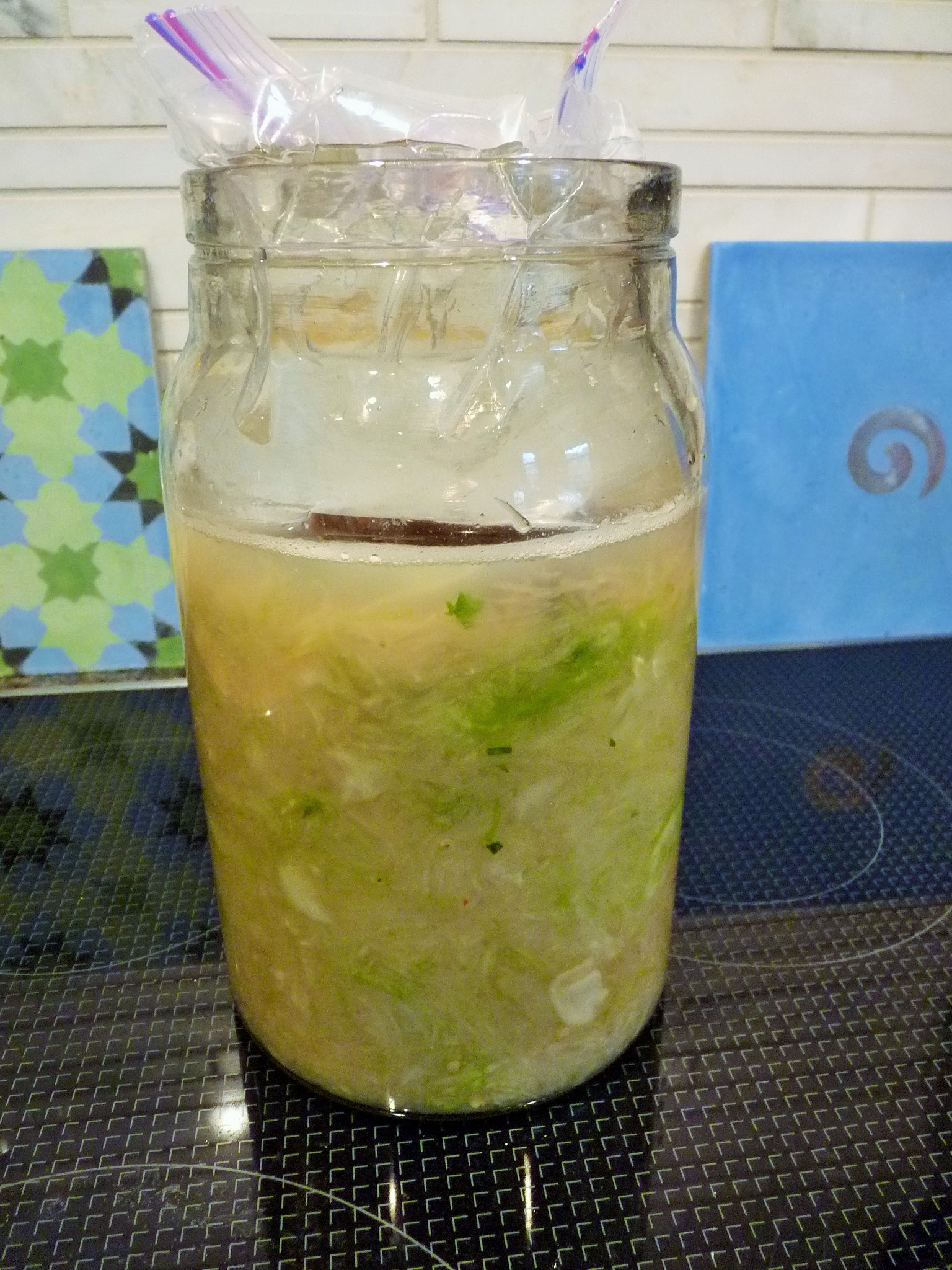 Leider habe ich keinen Gärtopf aus Ton in Kanada, da habe ich den Kohl in ein stabiles Glas gestampft, die Gärflüssigkeit deckt den Kohl ab. Just perfect, sag ich mal! Ein Gefrierbeutel, gefüllt mit kleinen Steinen oder einer Steinscheibe und mit Wasser wird verschlossen und als Gewicht auf den gestampften Kohl gelegt. Dieser Abschluss ist wichtig, damit der Kohl keinen Sauerstoff bekommt.