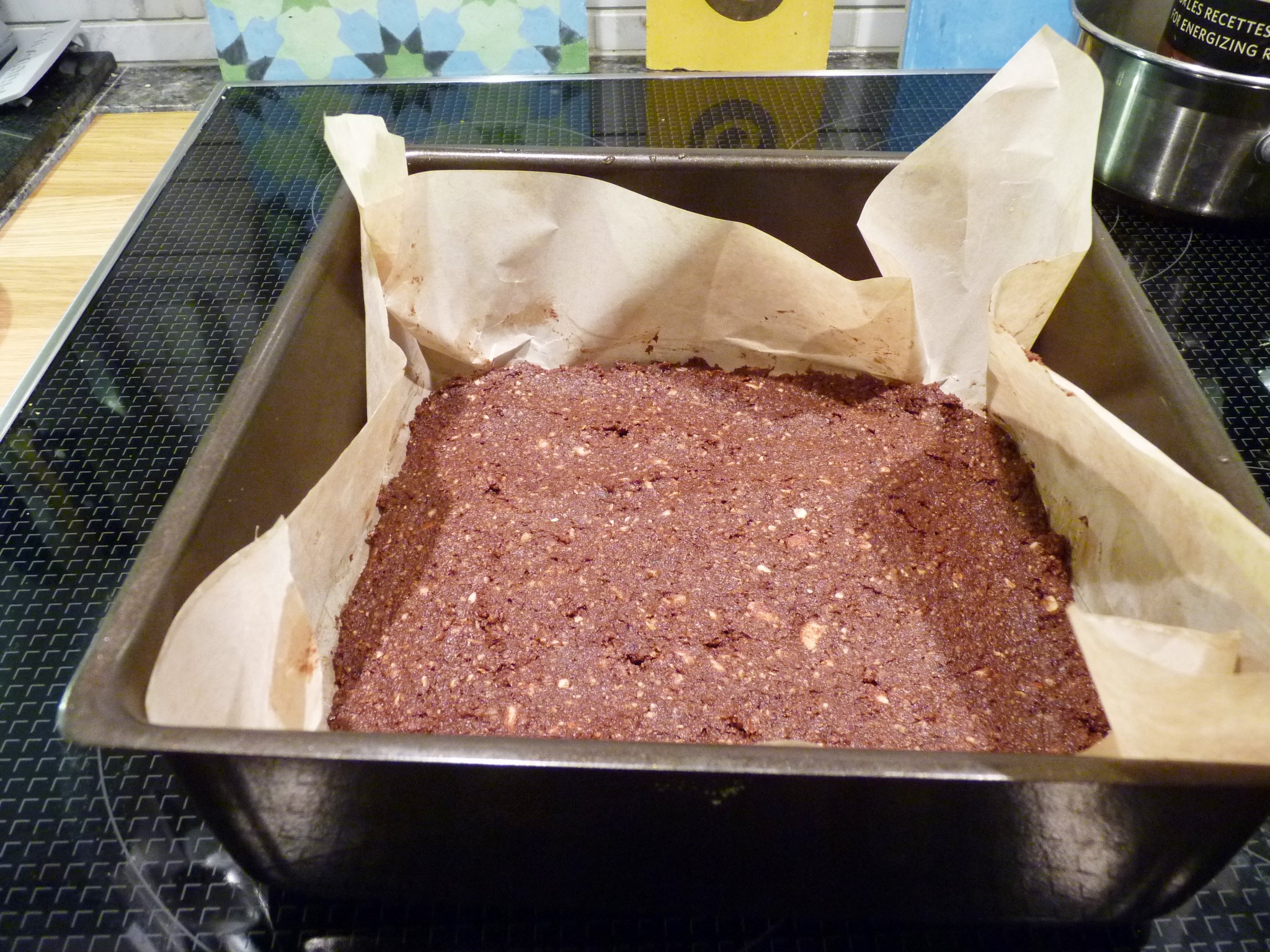 Für den Teig alle Zutaten, bis auf den Kakao, in einer Küchenmaschine zerkleinern, so fein, dass noch kleine Stücke zu finden sind. Den Kakao zum Schluss unter den Teig mixen. Eine rechteckige Form mit  Backpapier auslegen und den rohen Teig in die Form drücken. In die Gefriertruhe damit und ruhen lassen. Ich kann die Form auf die Terrasse stellen, denn wir haben satte minus 20 Grad in Montreal.