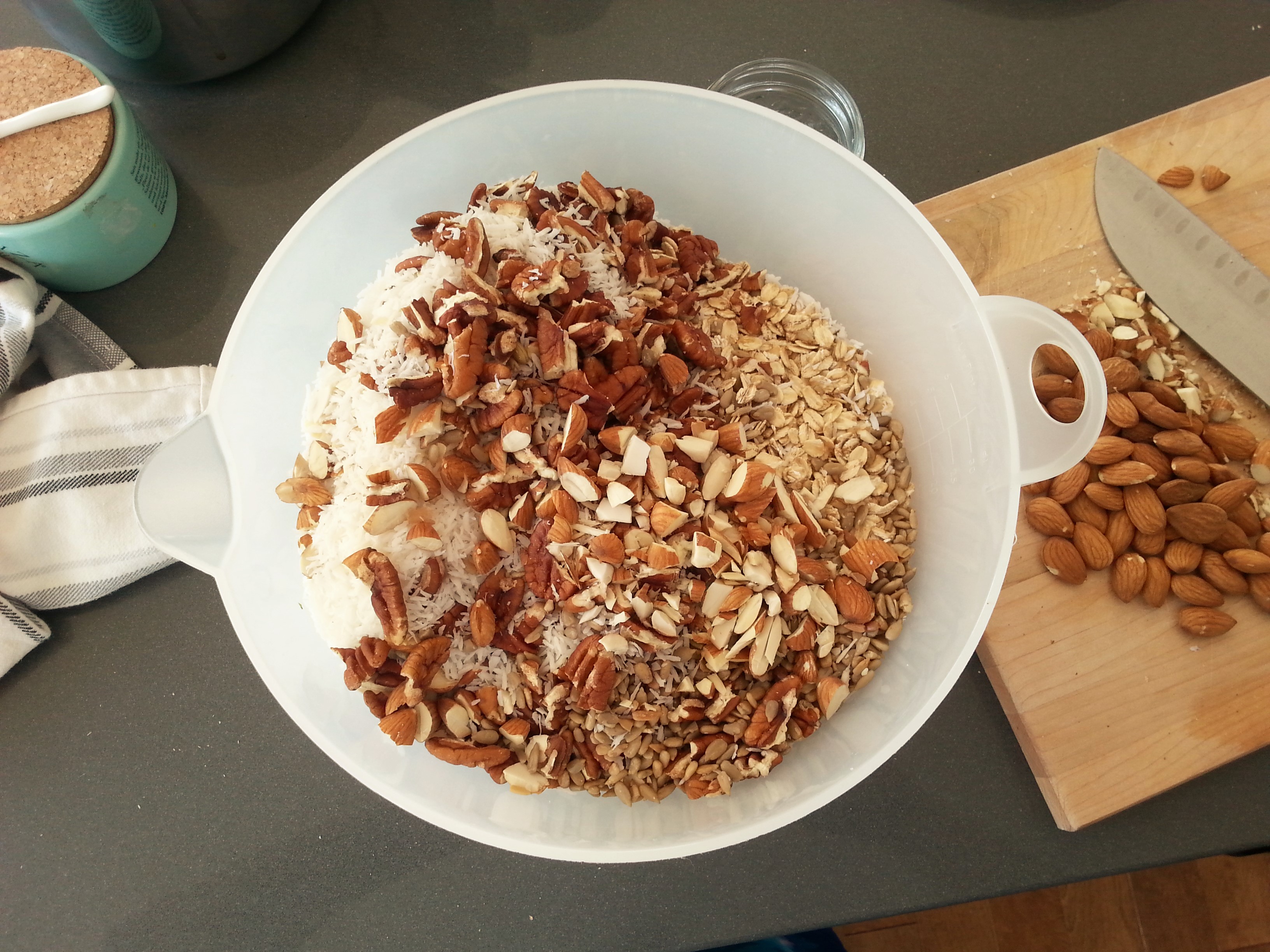 - 3 1/2 Tassen was auch immer, hier: 1 Tasse gehackte Mandeln, 1 Tasse Pecan, 1/2 Tasse Kürbiskerne, 1/2 Tasse Sonnenblumenkerne, 1/2 Tasse Kokosraspeln