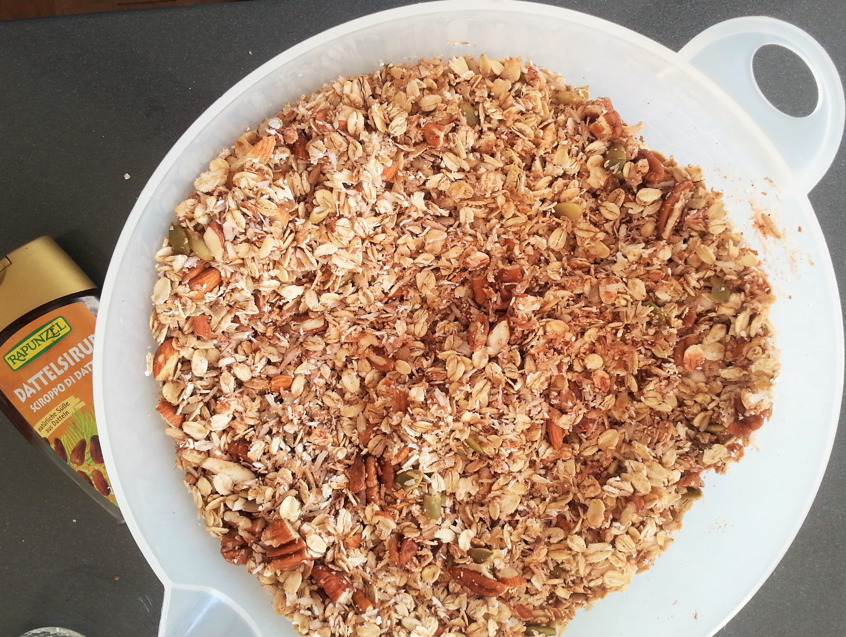 Alle Zutaten mischen und das Öl und die Süße einmassieren. Es muss sehr gut auf alles verteilt werden, aber auch hier gilt, wer mehr Öl oder Süße möchte, rein damit. Granola aus dem Laden hat im Schnitt 10g Zucker auf 40g Flockenmix.