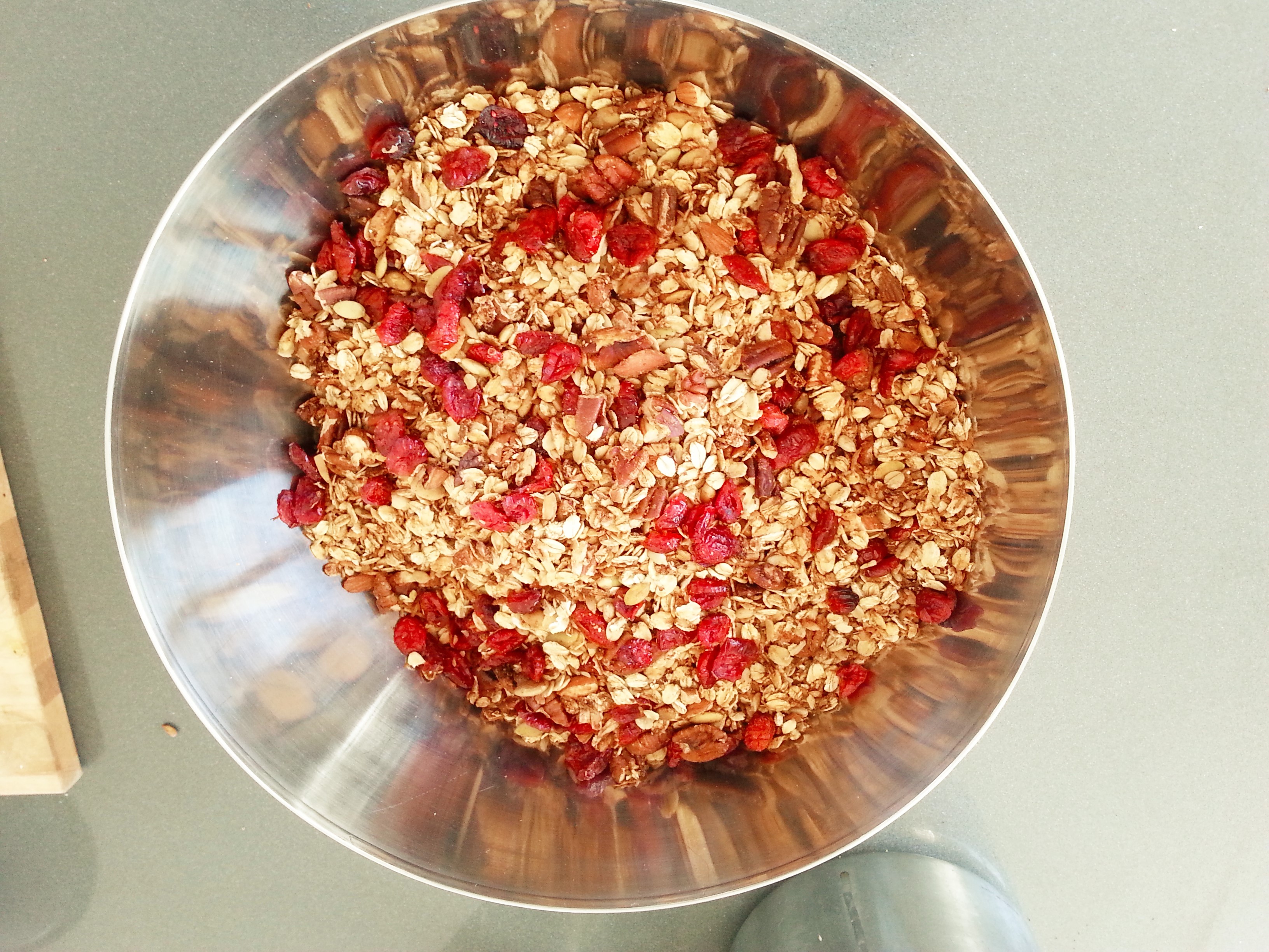 aus dem Ofen fülle ich mein Granola in eine Schüssel zum Abkühlen und gebe Cranberries und Reis crispy dazu.