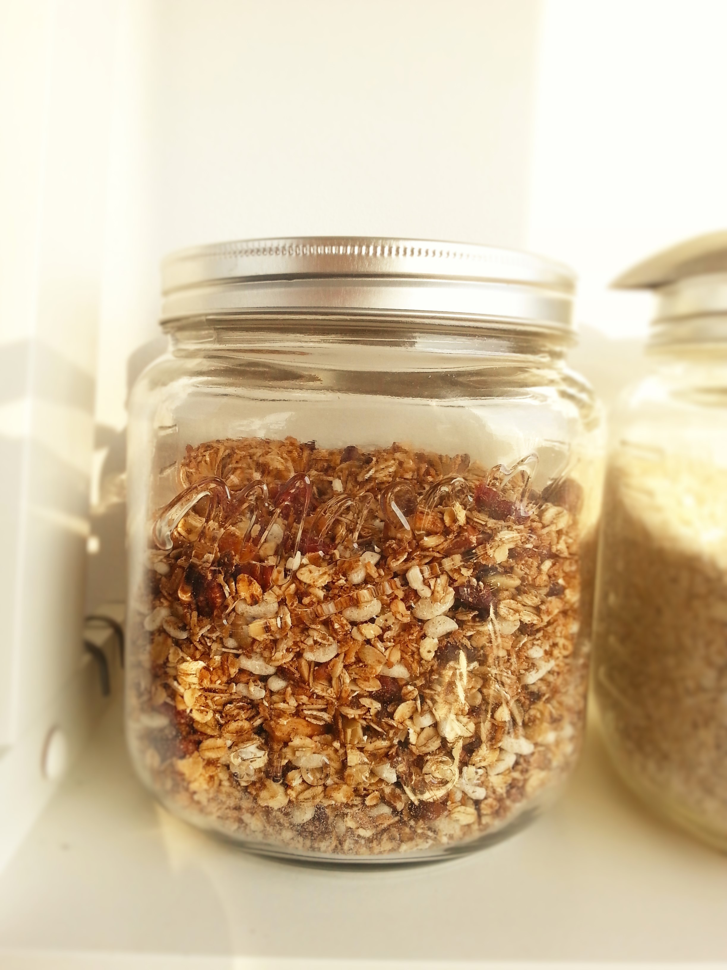 In meinem riesen Mason Glas mit Deckel hält es sich nicht so lange, weil mein Mann es oft als Zwischenmalzeit ißt.
