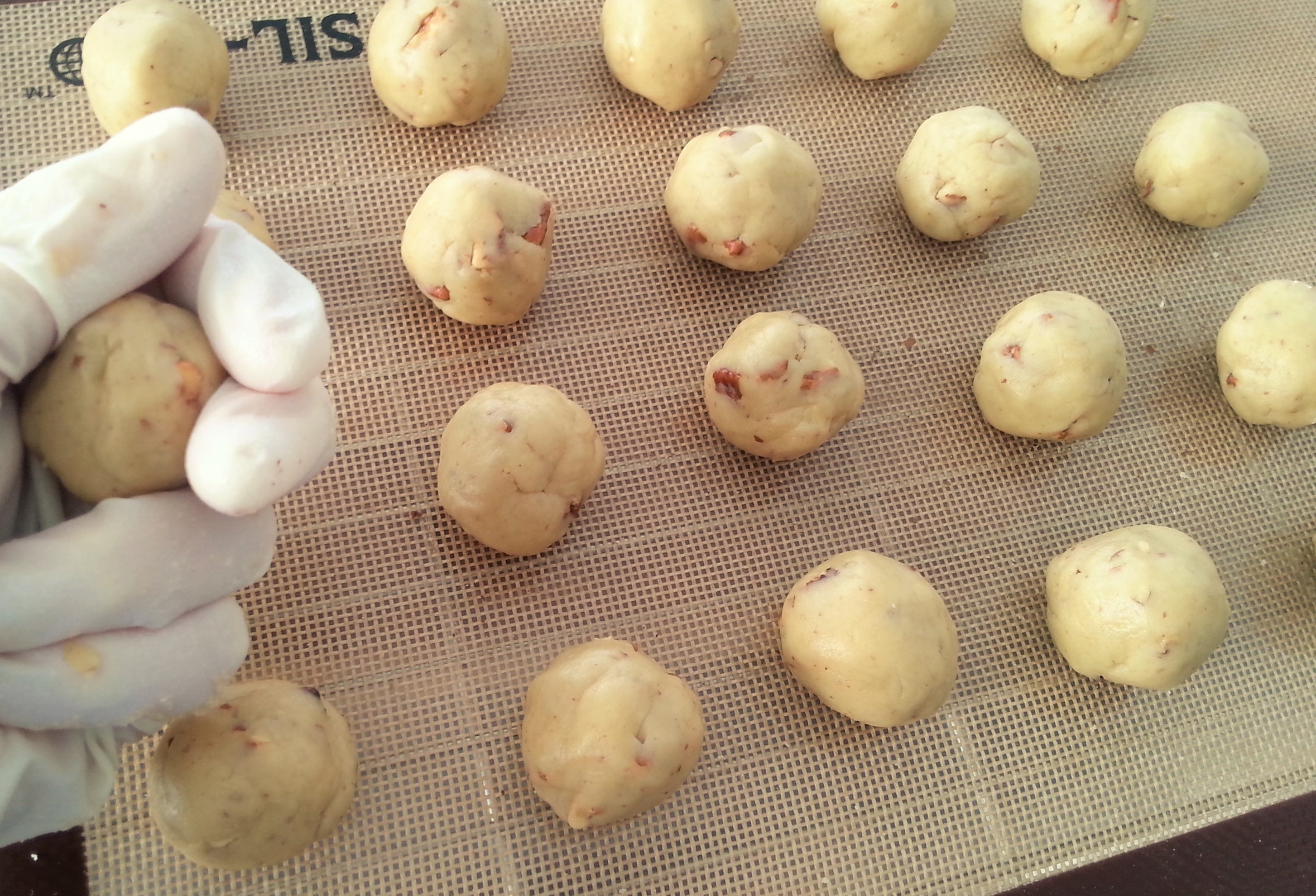 Alles Zutaten zu einem Teig verkneten und im Kühlschrank 30  min ruhen lassen. Ich mache es anders herum. Ich forme gleich 20 pecan balls und lass sie dann im Kühlschrank ruhen. Ich habe Beides ausprobiert und keinen Unterschied festgestellt. Falls der Teig zu krümelig ist, etwas eiskaltes Wasser dazugeben, aber nur ein bisschen. Ich trage einen latex Handschuh beim Kneten, das ist jetzt kein Fetisch, sondern es  bleibt kein Teig an den Fingern und unter den Fingernägeln kleben und es geht schneller.