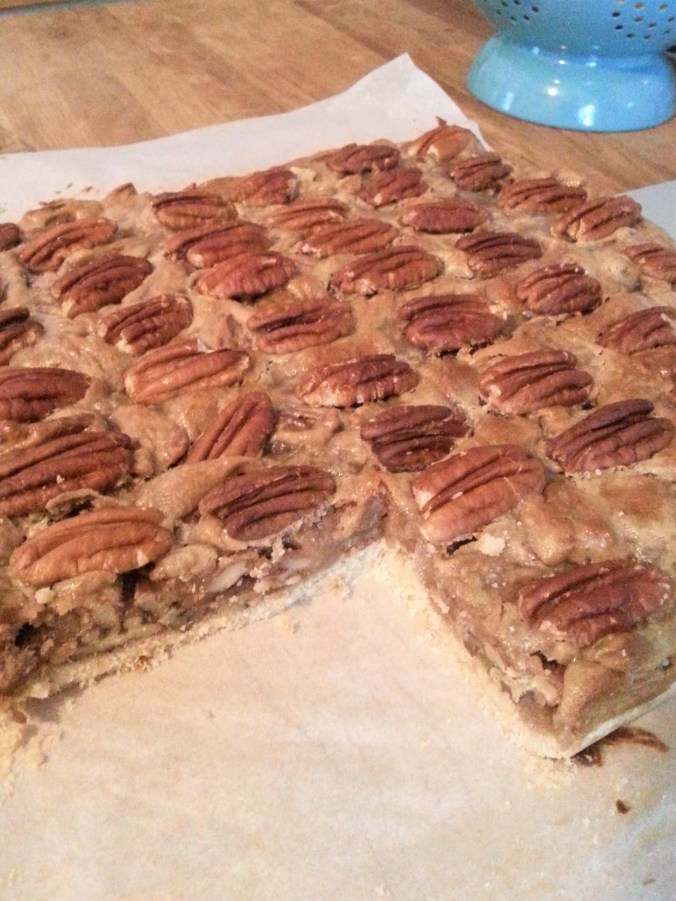Die Masse auf den Boden geben und nochmal mit Pecan belegen, etwas andrücken und bei ca. 20-25 Min bei 170 Grad backen. Die Nüsse verbrennen schnell, daher immer beobachten, evtl. etwas länger im Ofen lassen, auch wenn er schon ausgeschaltet ist.