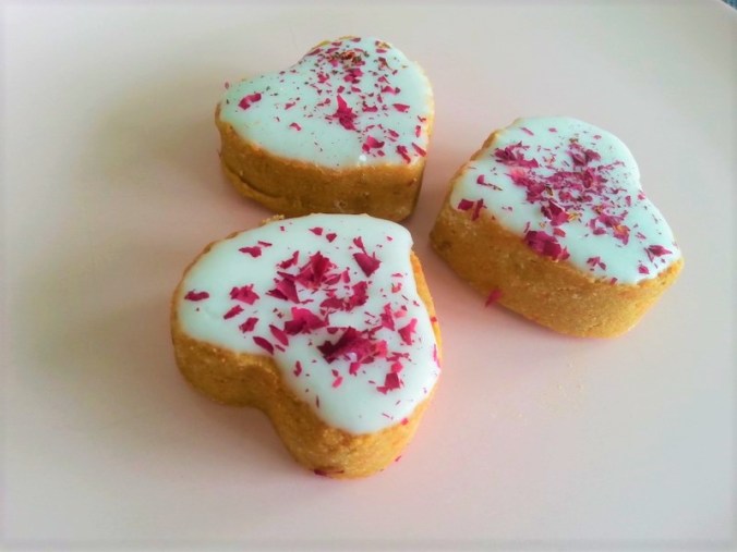 zu einer glatten Creme verrühren , 150g warme Flüssigkeit (Zitronensaft und gefiltertes Wasser) langsam eintropfen lassen und schnell verrühren.  Die dickfüssige Creme etwas fester werden lassen und über die Formen geben und mit Rosenblättern garnieren. Ist wie eine Kokosbutter ganache. Ein paar Blüten drauf gestreut und es sieht nach Frühling aus. In diesem Fall Rosenblätter.