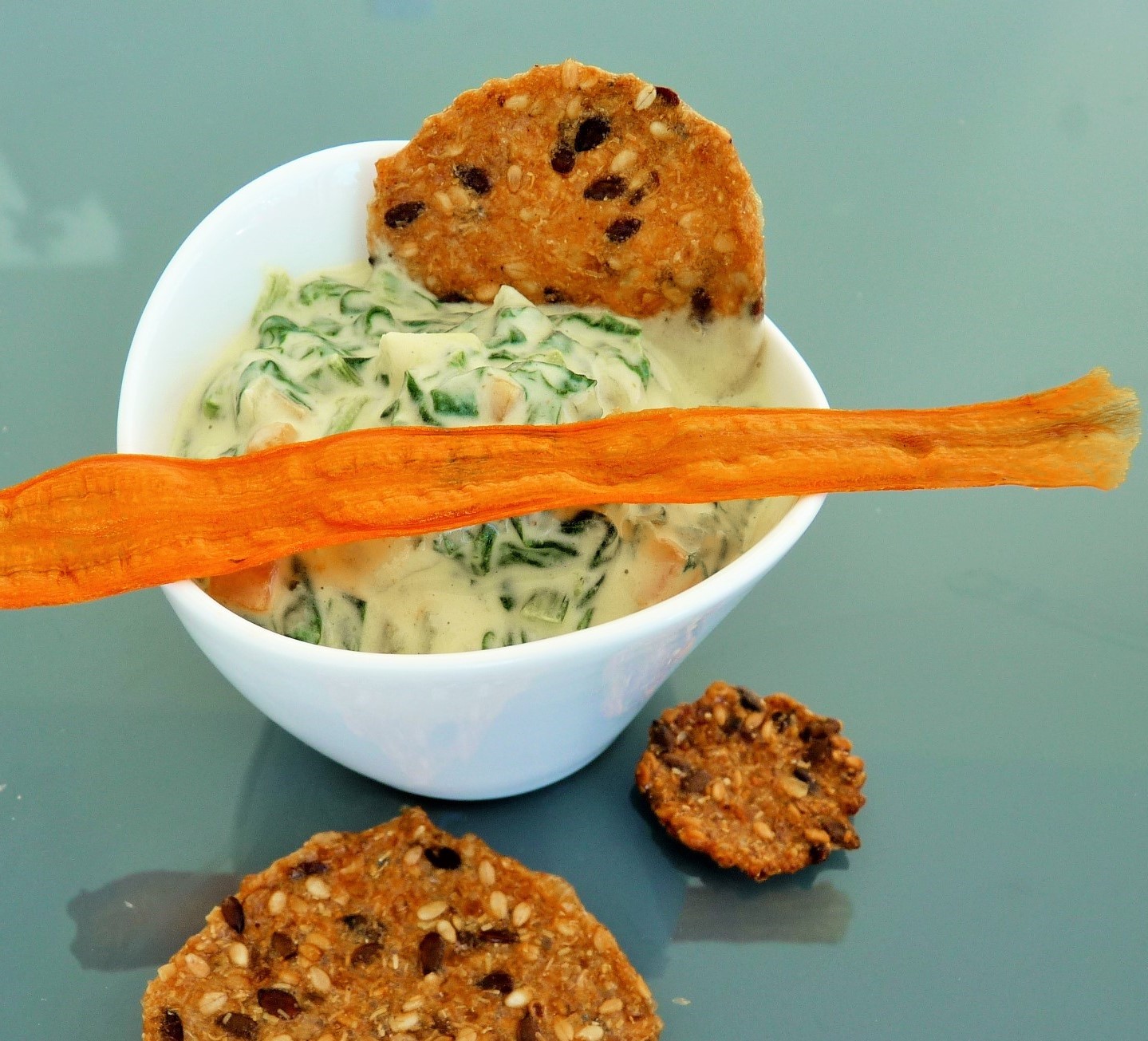 Dazu gibt es knusprige Karotten Chips, dehydriert im Dörrgerät oder im Backofen.
