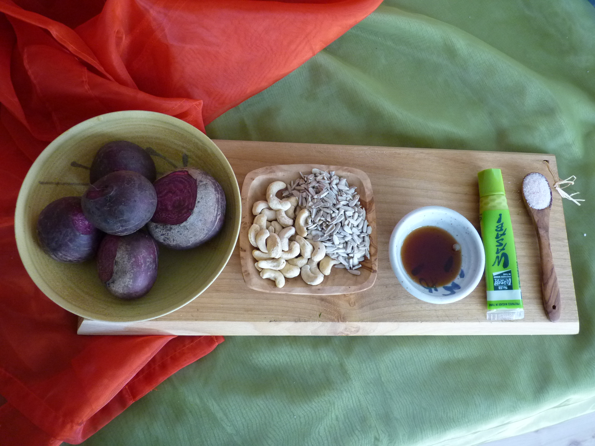 - 4-5 Red Beets, cooked and skin removed, set aside one red beet to chop it up in little pieces