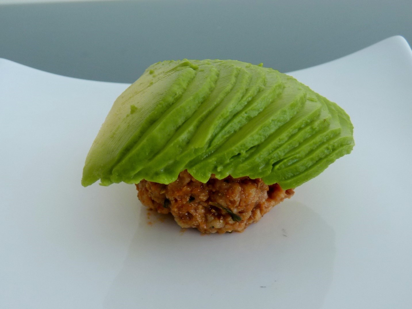 make a kind of dough out of 3 rice or kamut waffle, soak it in tomato juice, add fresh chopped cilantro, salt, pepper, wasabi paste. Let it set in the fridge for few hours. Make little balls and cut the avocado in very thin slices