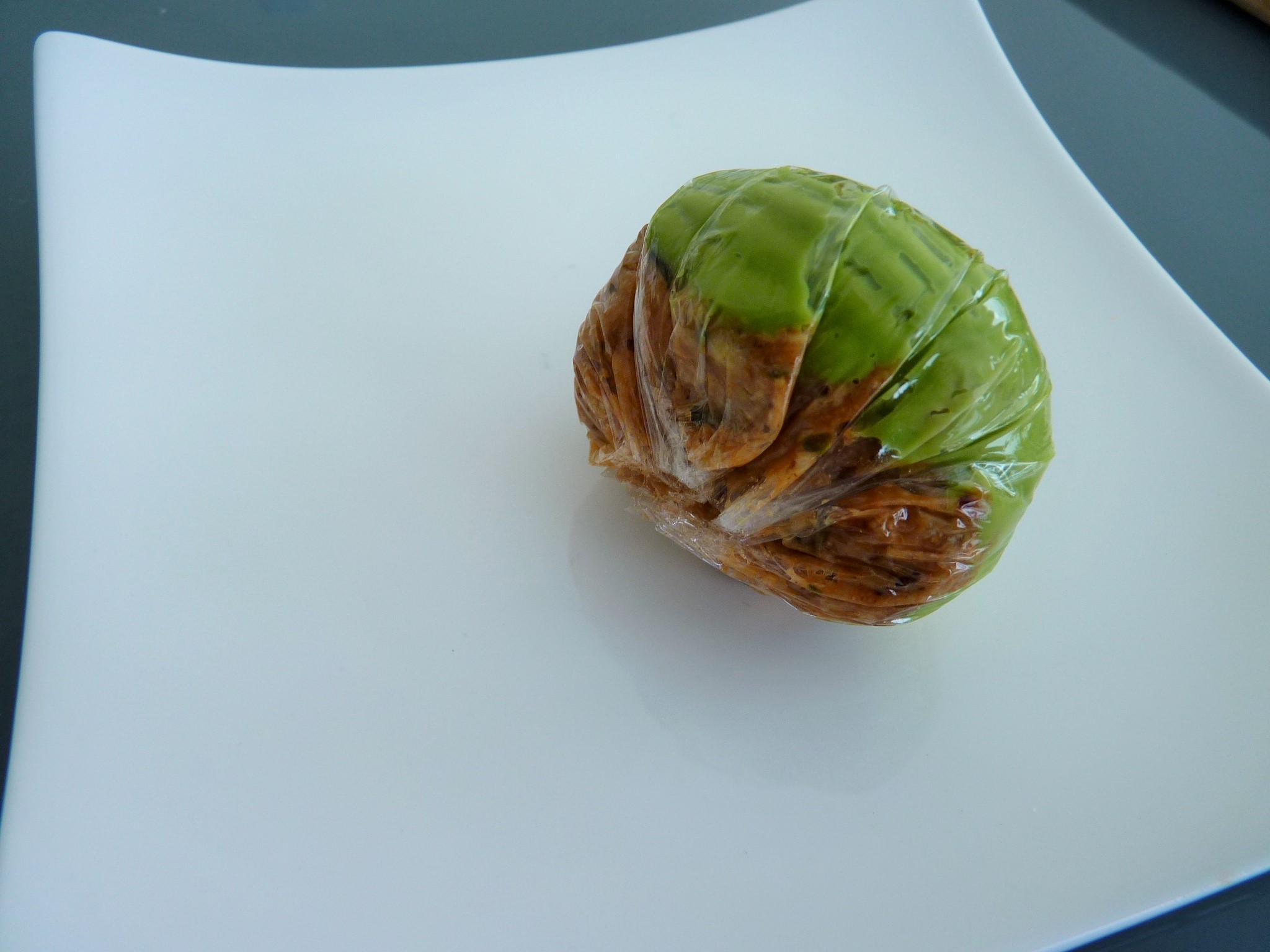 cut the plastic end off, unwrap and present the avocado bon bon on a plate with chilli sauce or anything you like