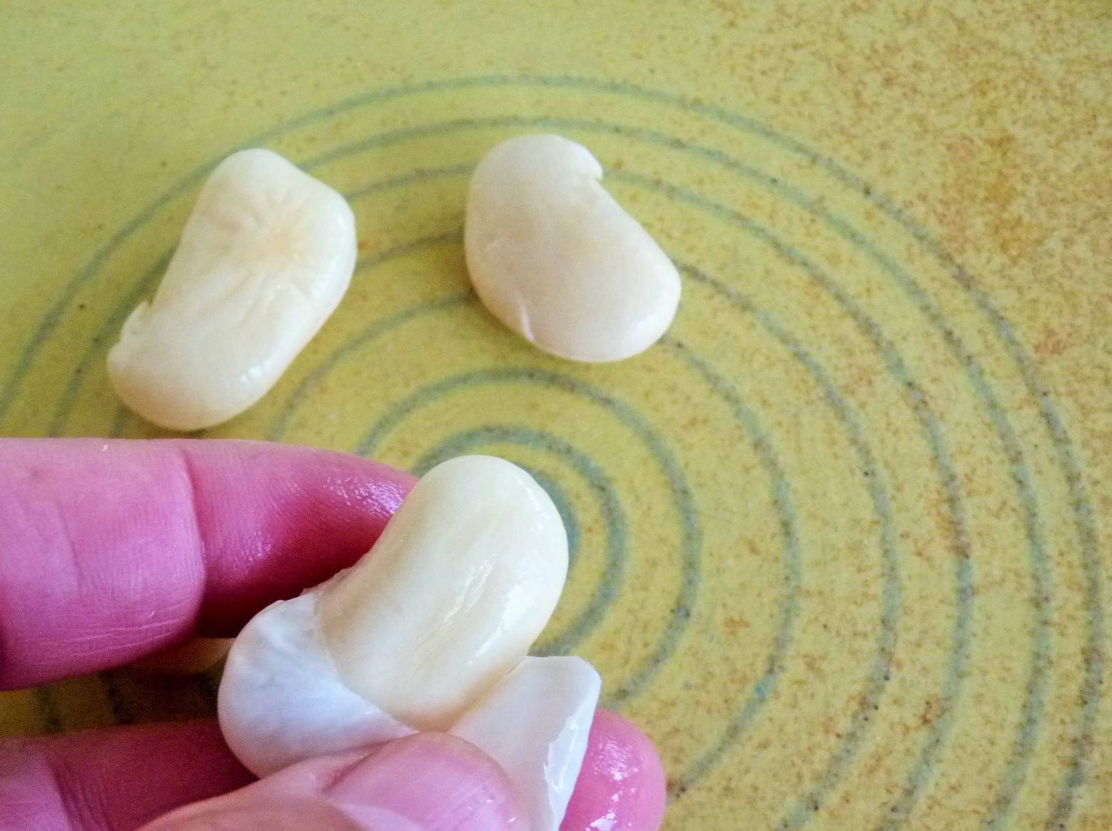 Jetzt wird es wichtig! Damit der Bohnenaufstrich oder die Creme besonders geschmeidig wird, muss die ledrige Haut der großen Bohnen abgezogen werden- das heißt einfach mit dem Fingernagel etwas die Haut einreißen und dann den Kern rausdrücken.